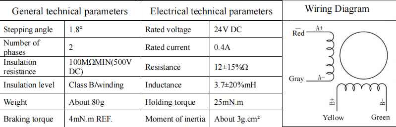 | Stepping angle | 1.8° | Rated voltage | 24V DC |